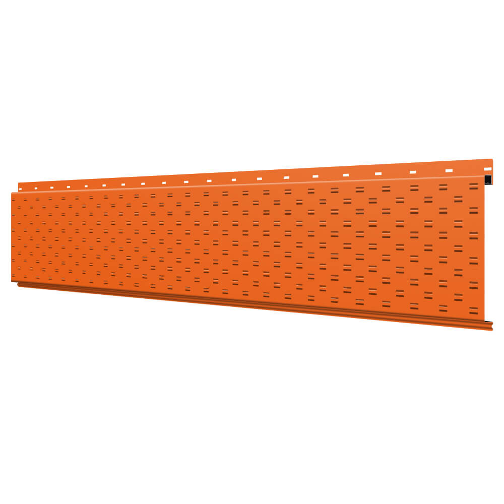 Линеарная потолочно-стеновая панель с ПЕРФОРАЦИЕЙ для вентиляции цвет RAL2004 Оранжевый Апельсин применяется в качестве софитов для подшивы крыши, наружной и внутренней отделки потолков, стен, фронтонов фасада дома в Алматы.