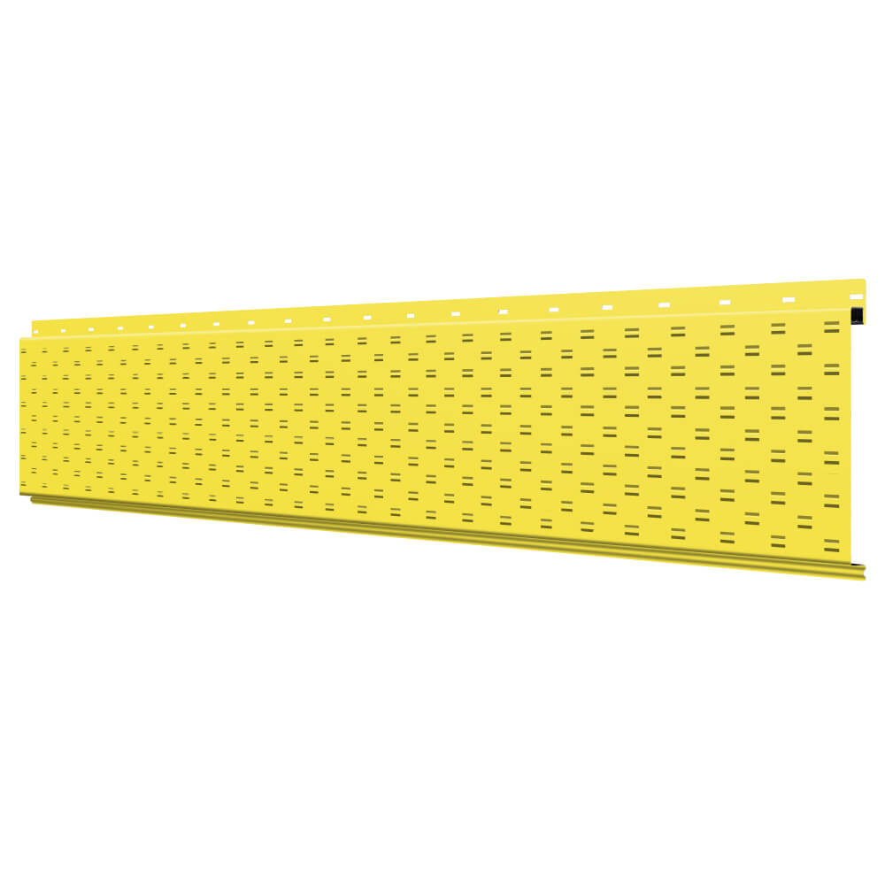 Линеарная потолочно-стеновая панель с ПЕРФОРАЦИЕЙ для вентиляции цвет RAL1018 Желтый применяется в качестве софитов для подшивы крыши, наружной и внутренней отделки потолков, стен, фронтонов фасада дома в Алматы.