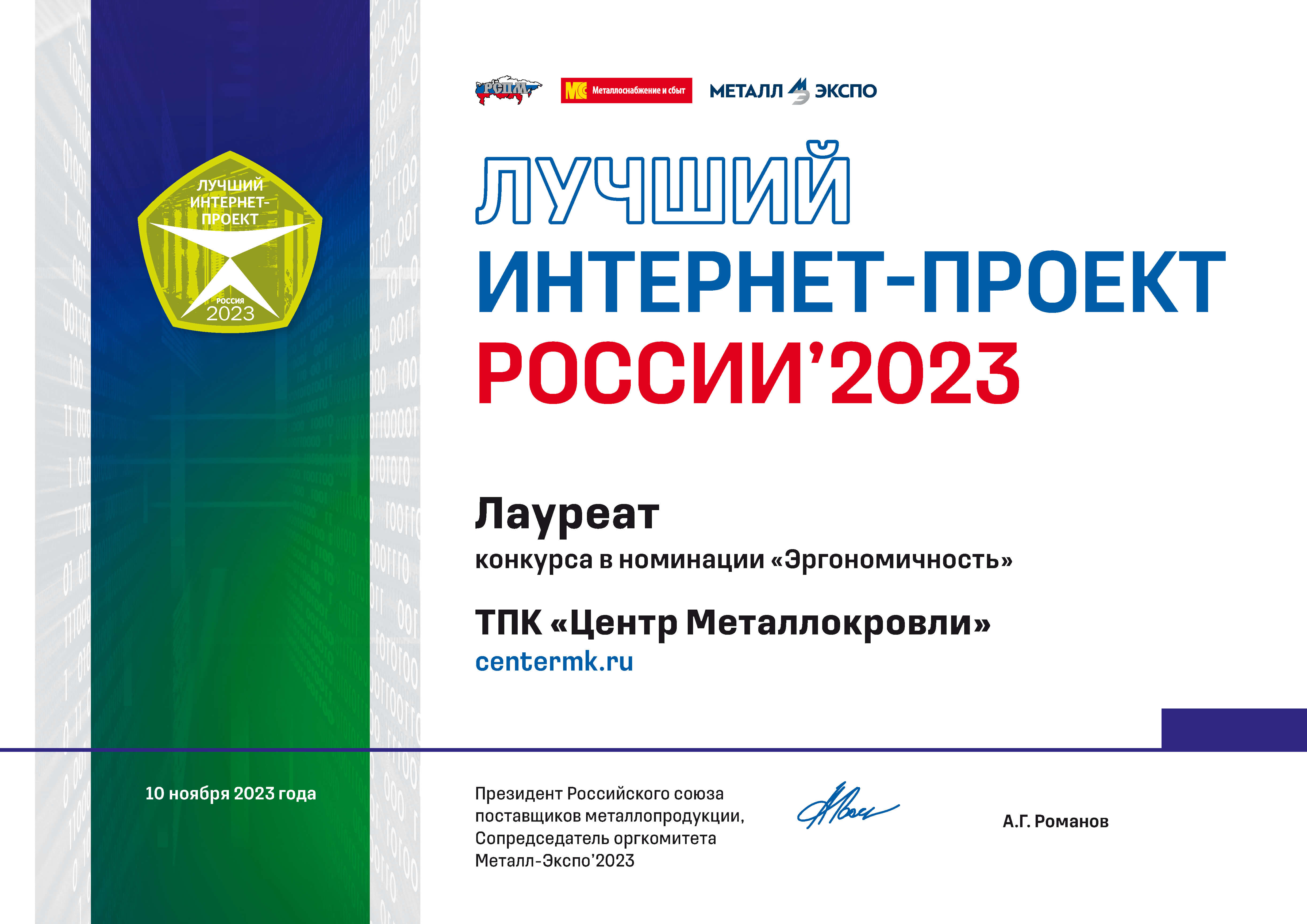 ТПК «Центр Металлокровли» — лауреат конкурса «Лучший интернет-проект России 2023»